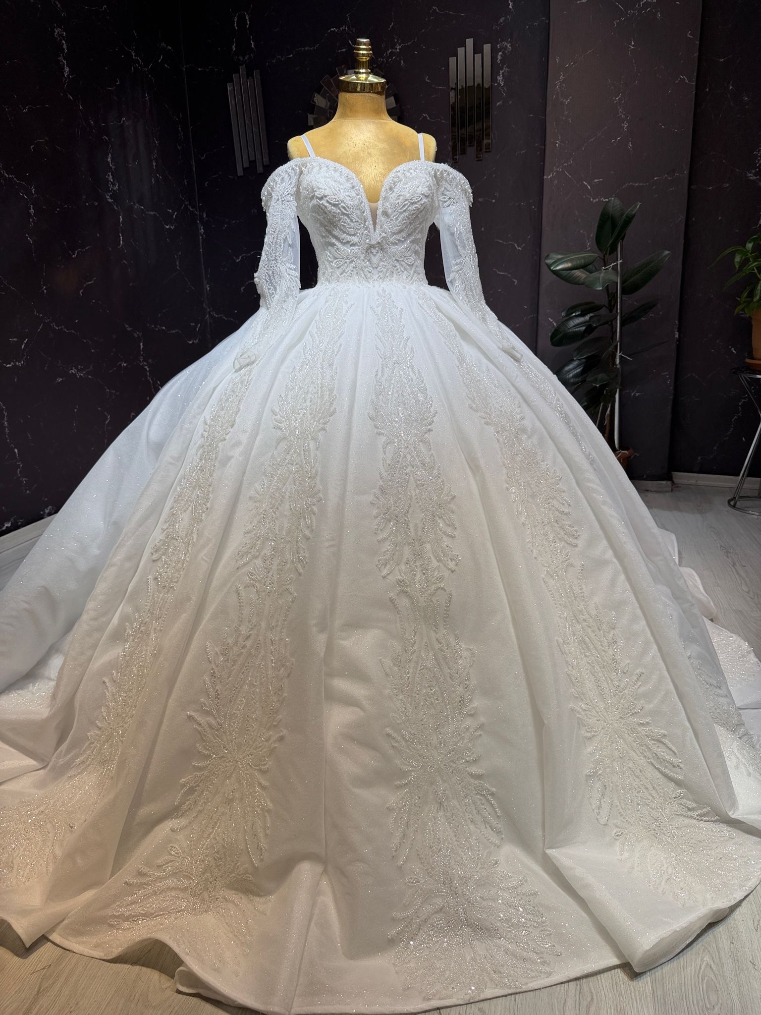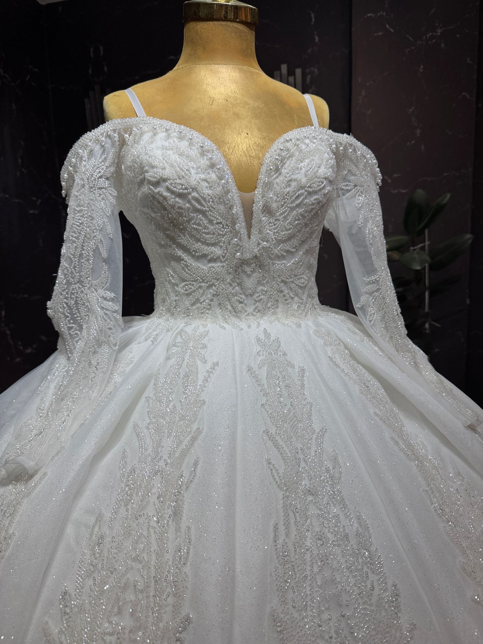 Cette robe de mariée au col bateau avec perlage est une création exquise qui incarne l’élégance intemporelle et la sophistication. Cette robe est conçue pour la mariée qui recherche un style classique avec une touche de glamour.