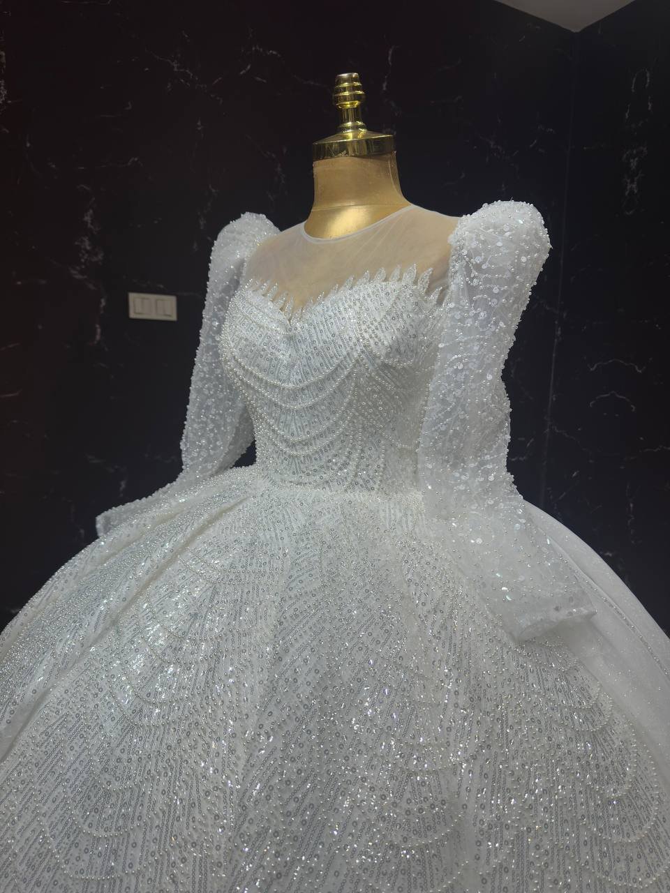 Pour une touche de sophistication, cette robe de mariée en plus dentelle est dotée de manches longues à épaule galon , tout pour être une vraie princesse.