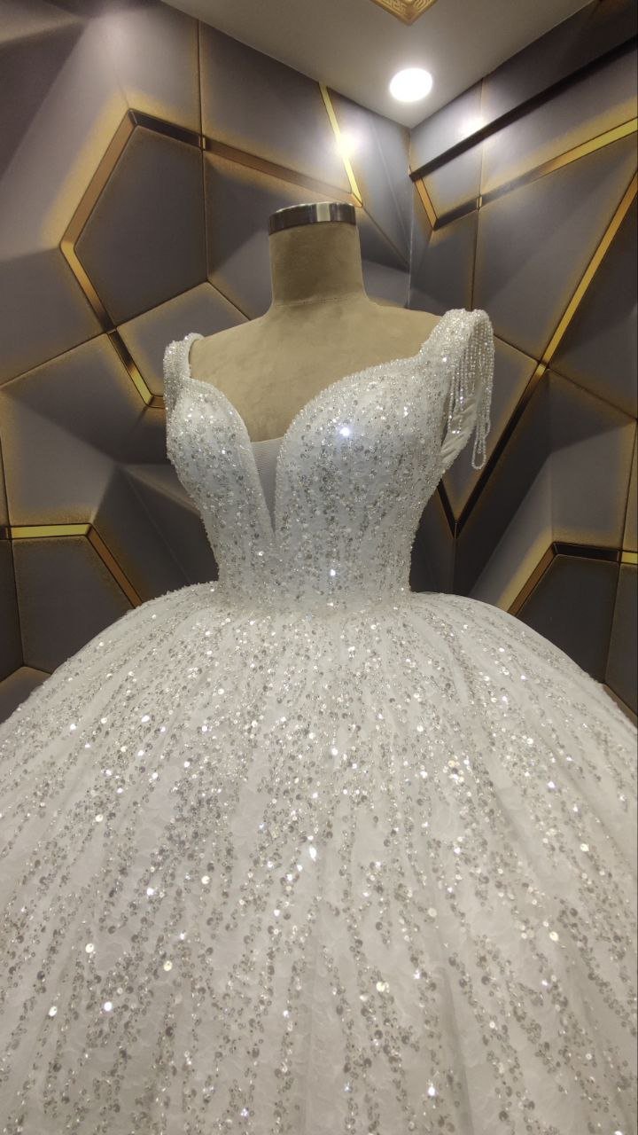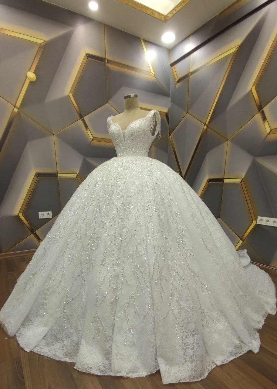 Cette robe de mariée met en valeur un décolleté en V créant une silhouette flatteuse