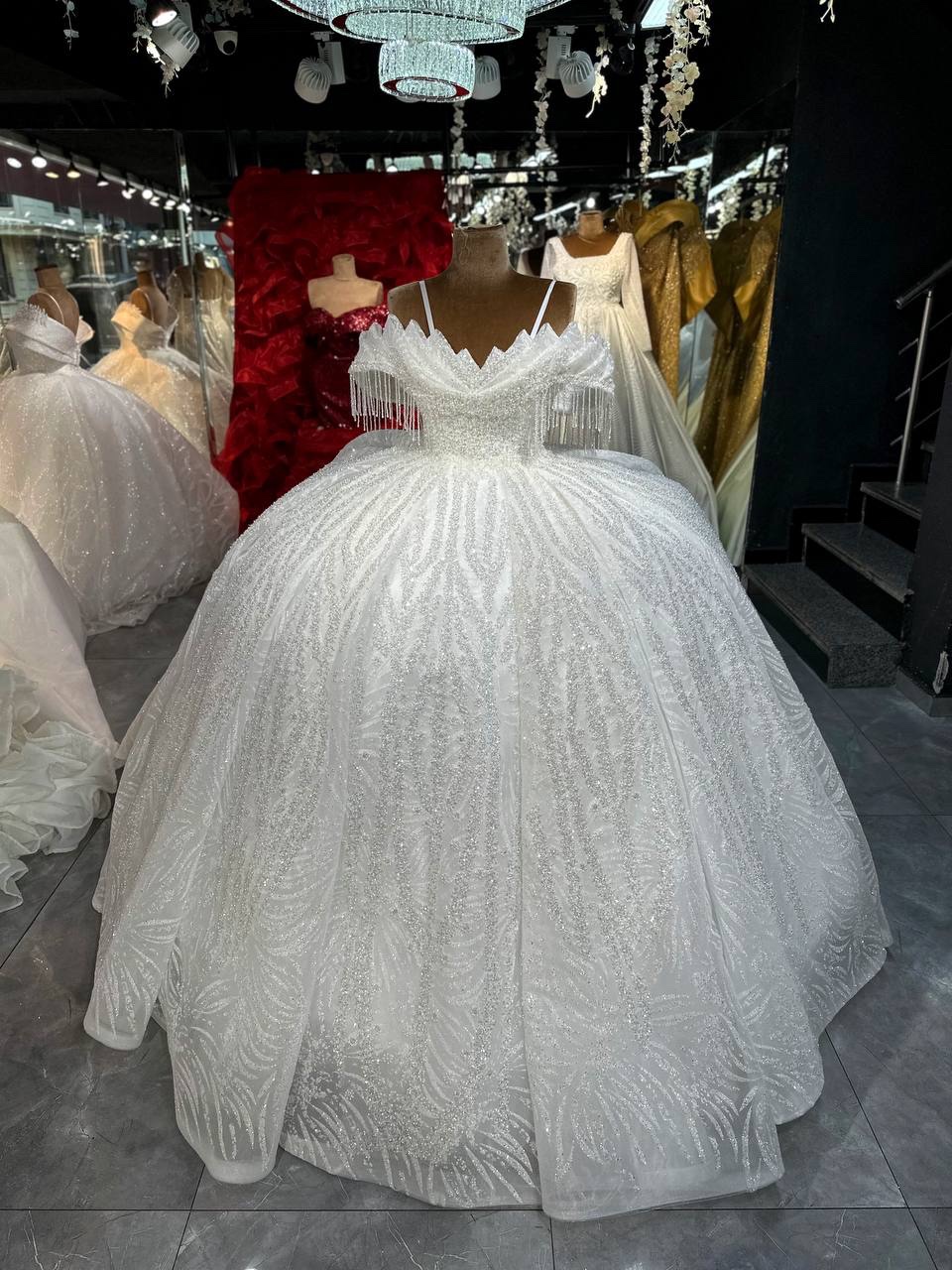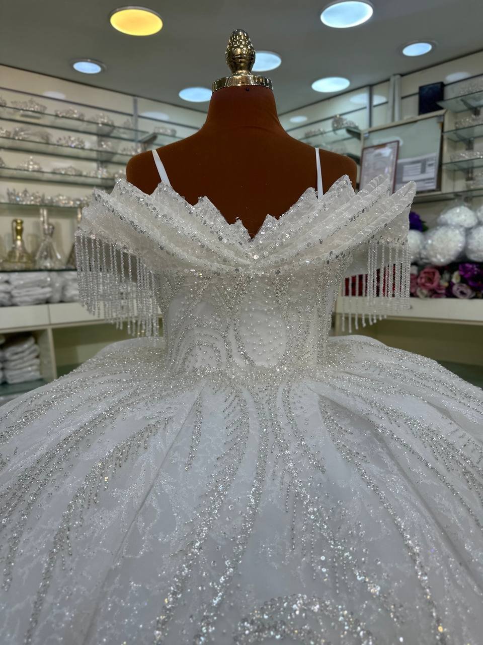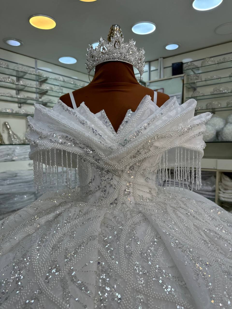 Cette robe de mariée au col bateau avec perlage est une création exquise qui incarne l’élégance intemporelle et la sophistication. Cette robe est conçue pour la mariée qui recherche un style classique avec une touche de glamour.