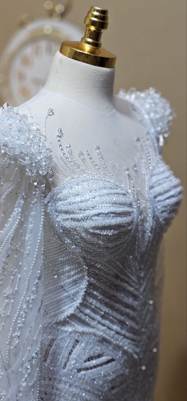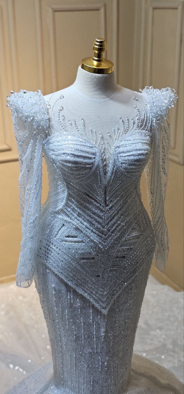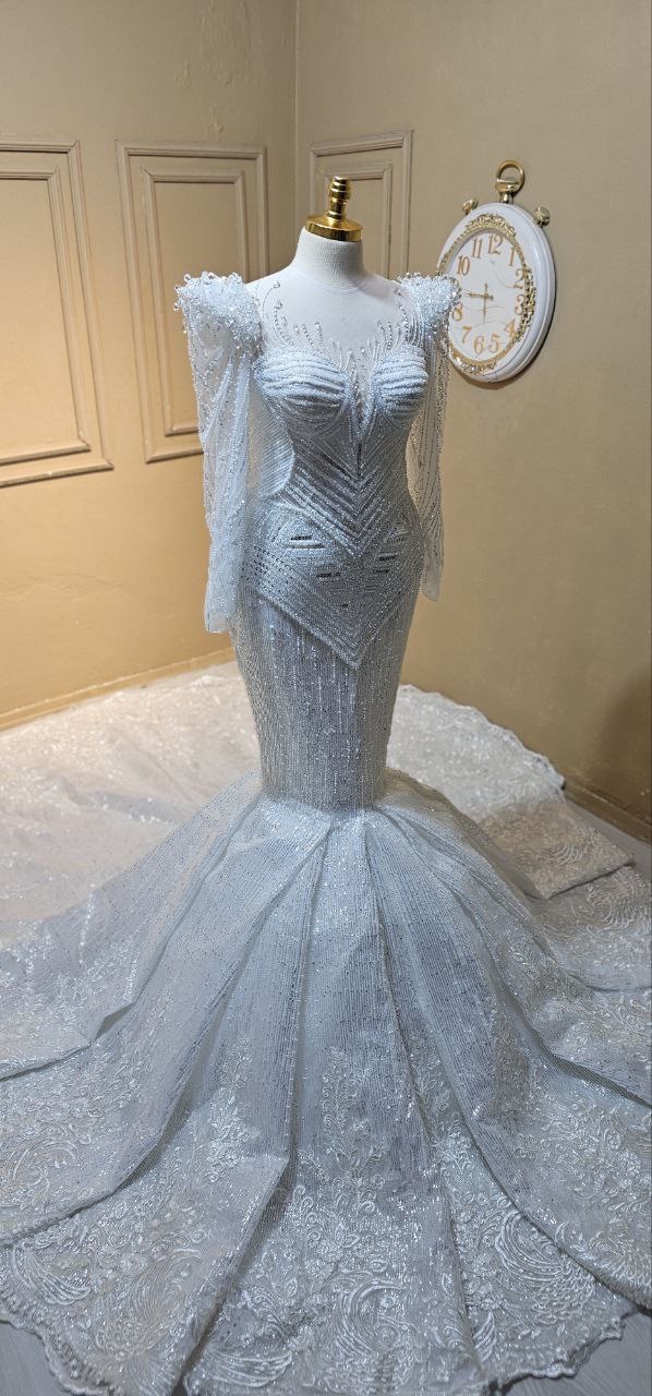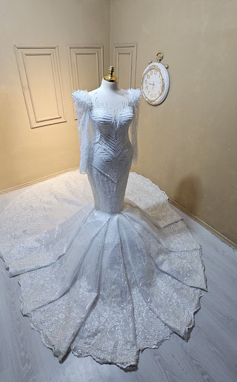 Plongez dans la sensualité et l’élégance avec notre robe de mariée sirène. Cette robe est conçue pour embrasser chaque courbe de votre silhouette, mettant en avant votre féminité naturelle. Chaque détail de cette robe est une œuvre d’art en soi